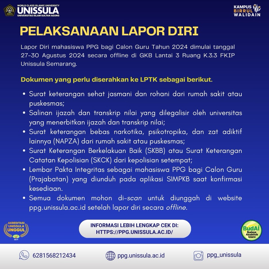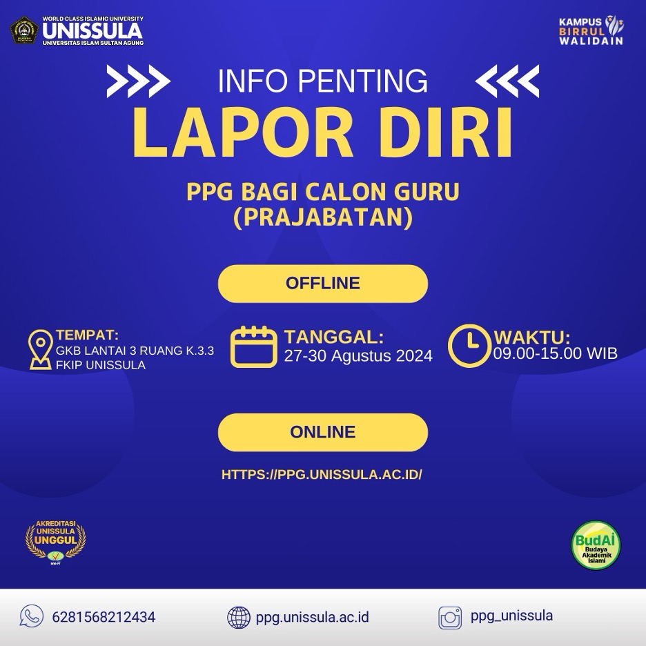 Pelaksanaan lapor diri PPG bagi Calon Guru Tahun 2024 FKIP Unissula dilaksanakan tanggal 27-30 Agustus 2024 di Gedung Kuliah Bersama (GKB) Lantai 3 Ruang K.3.3 FKIP Unissula.
